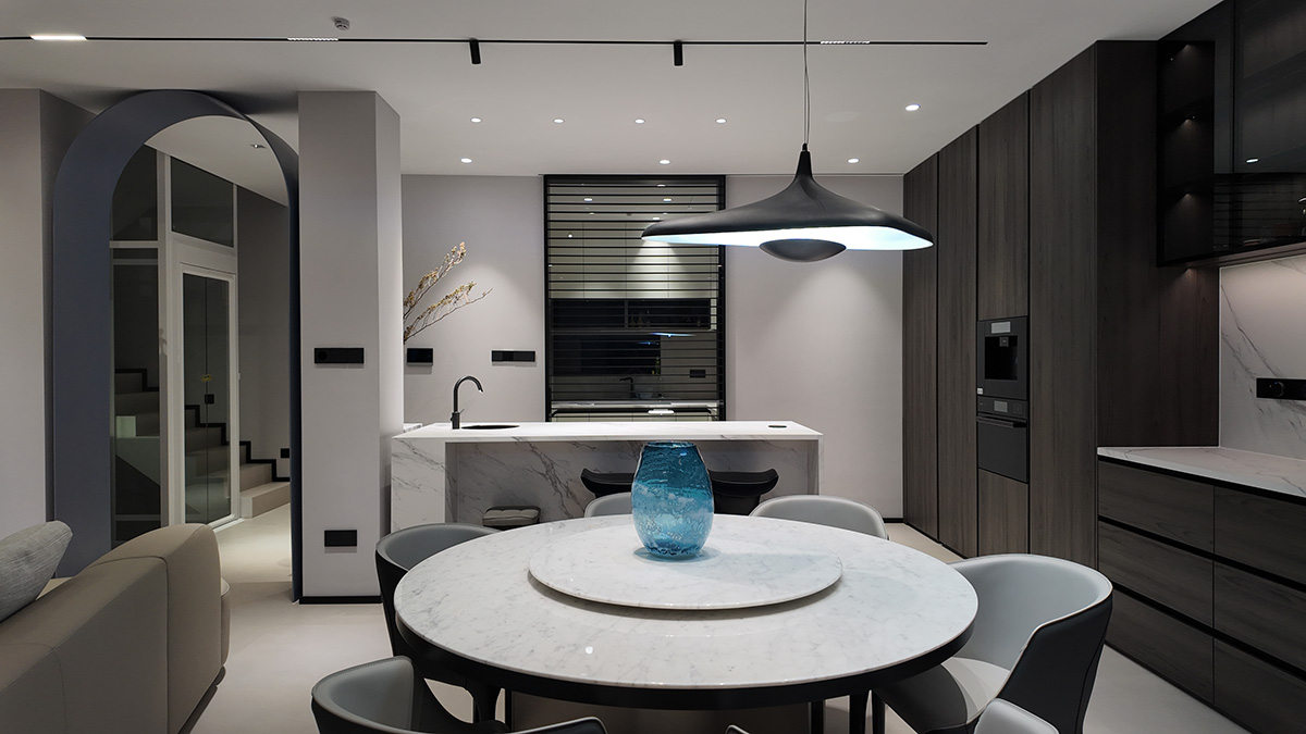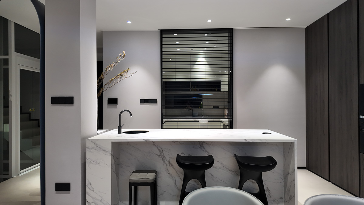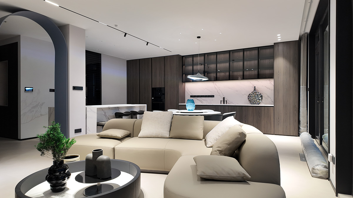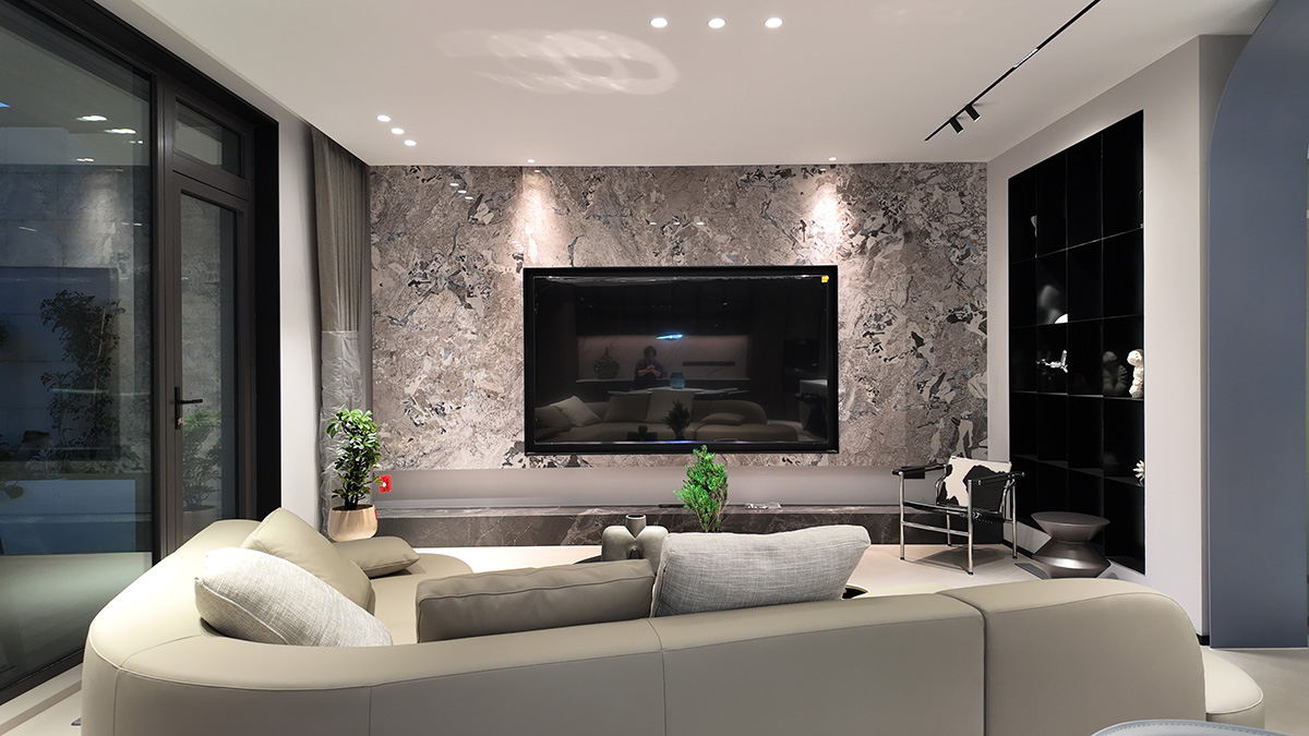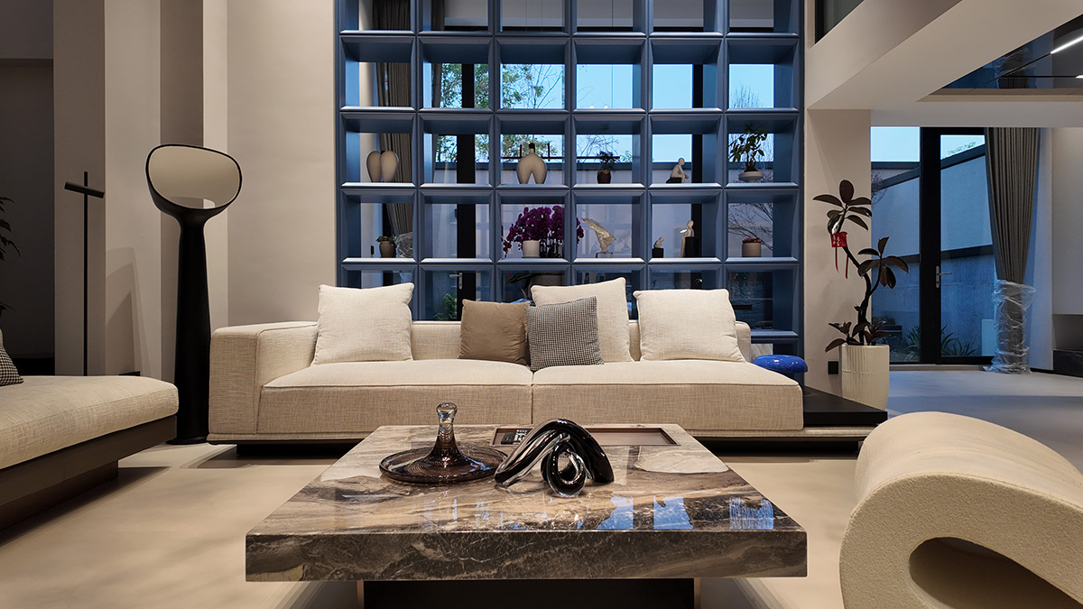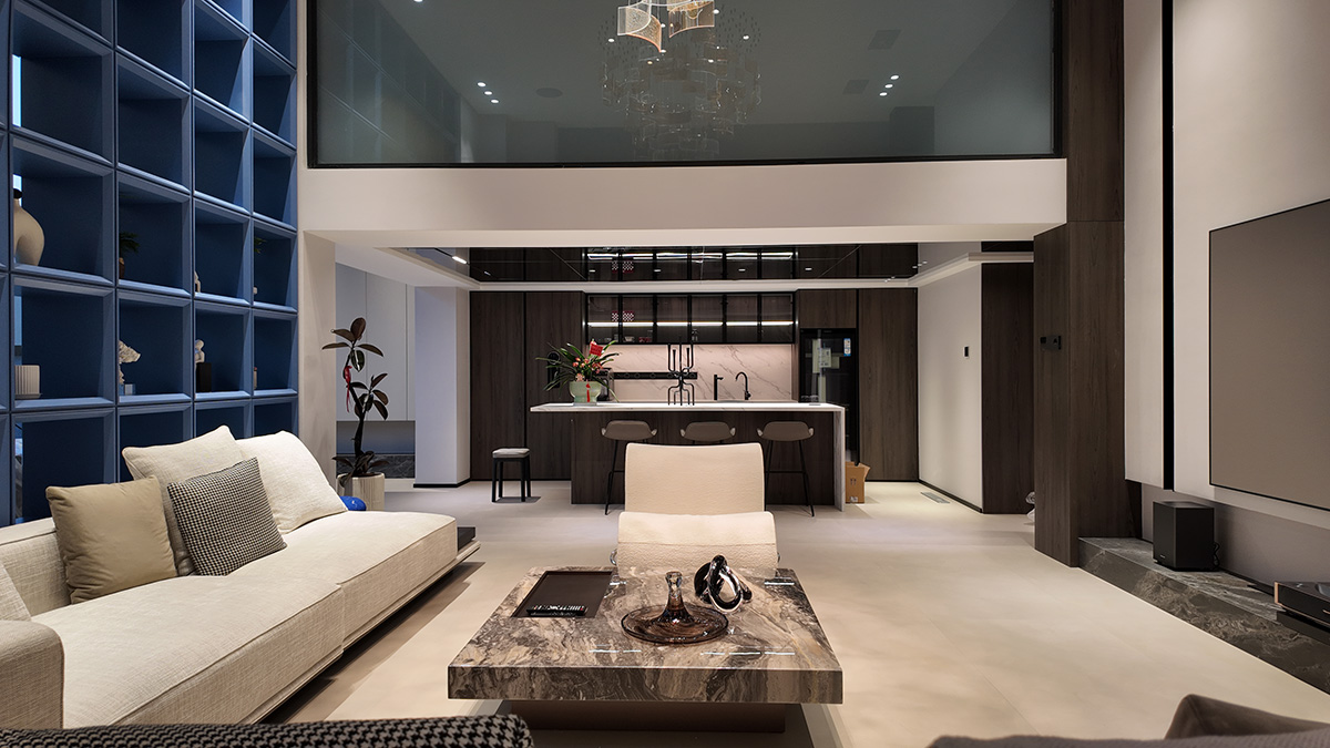 克莱因蓝的通高柜体以强烈的视觉张力奠定空间基调,而低饱和度的布艺沙发却以松弛的褶皱与柔和曲线,为空间注入一抹轻盈的灵动。自然光线穿过镜面天花与蓝色飘窗,在理石纹理与亚麻材质间跳跃,茶香与汗水的气息在此交织——这里是理性与感性的平衡场,亦是自由灵魂的栖息地。