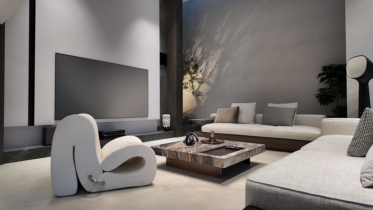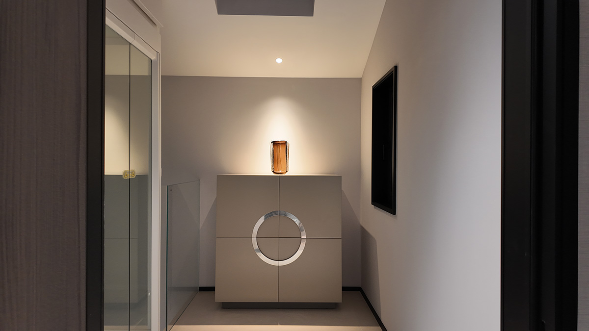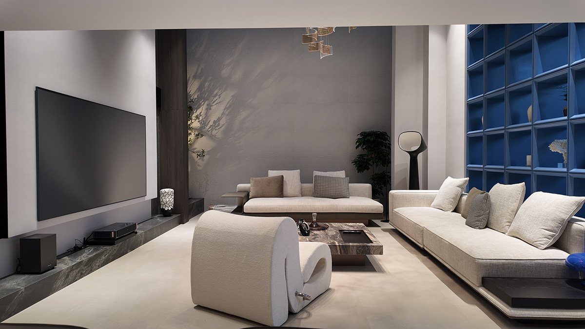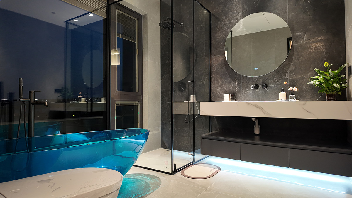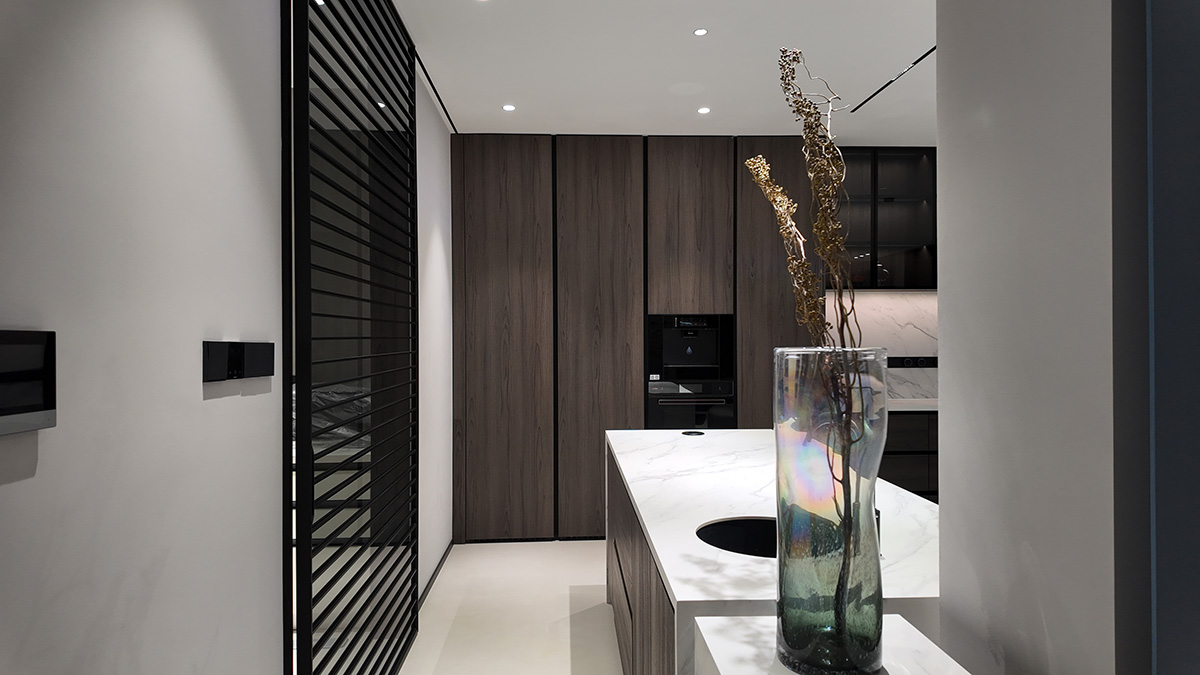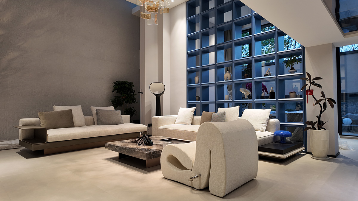 克莱因蓝的通高柜体以强烈的视觉张力奠定空间基调,而低饱和度的布艺沙发却以松弛的褶皱与柔和曲线,为空间注入一抹轻盈的灵动。自然光线穿过镜面天花与蓝色飘窗,在理石纹理与亚麻材质间跳跃,茶香与汗水的气息在此交织——这里是理性与感性的平衡场,亦是自由灵魂的栖息地。