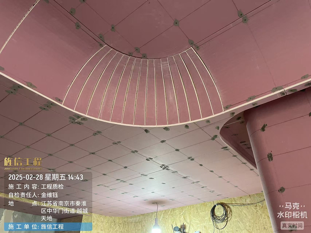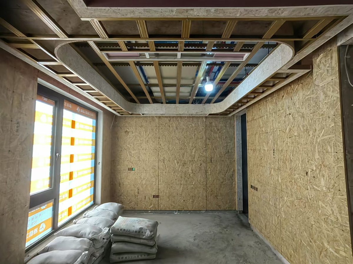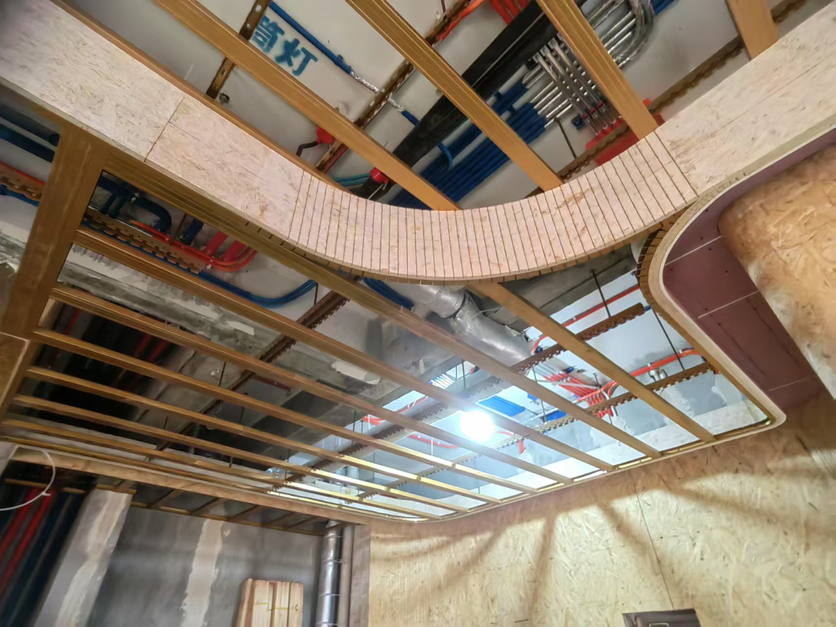 吊顶框架及基层框架,严格按照公司规范施工,吊顶立面龙骨间距60cm,吊顶平面龙骨间距不大于30cm,用铆钉及自攻螺丝固定,局部造型可用欧松板及木制龙骨,需要刷防火涂料,吊顶跨度大于90cm,必须打吊筋加主龙固定。如果室内满吊顶主灯灯位必须加吊筋或木龙骨加固处理。墙面基层框架在需要做基层的墙面放精准十字线,打木塞子固定,不大于40cm间距,基层板调至水平垂直。