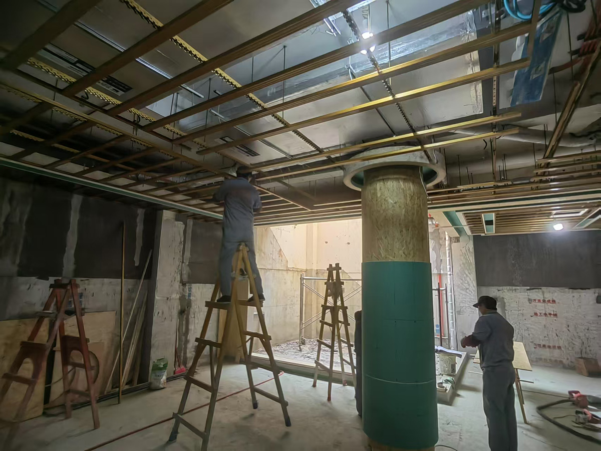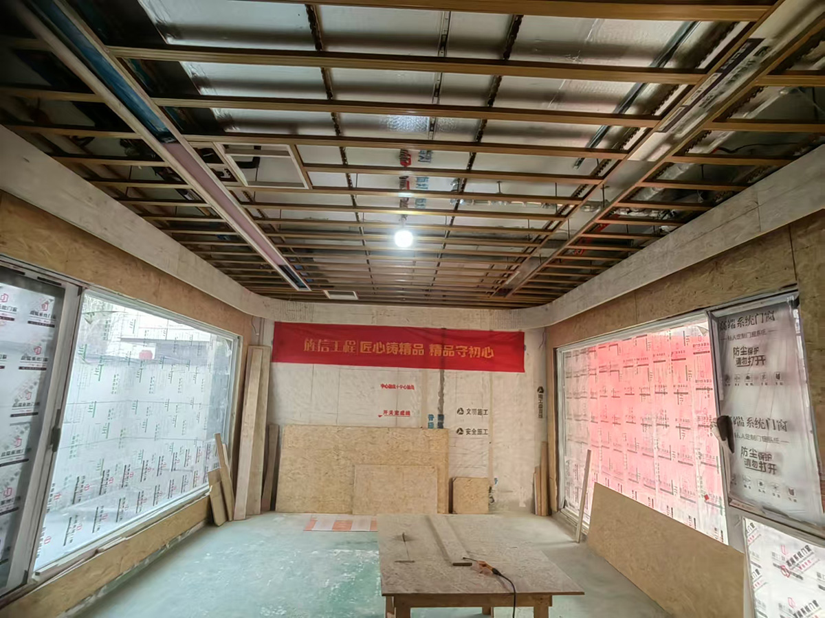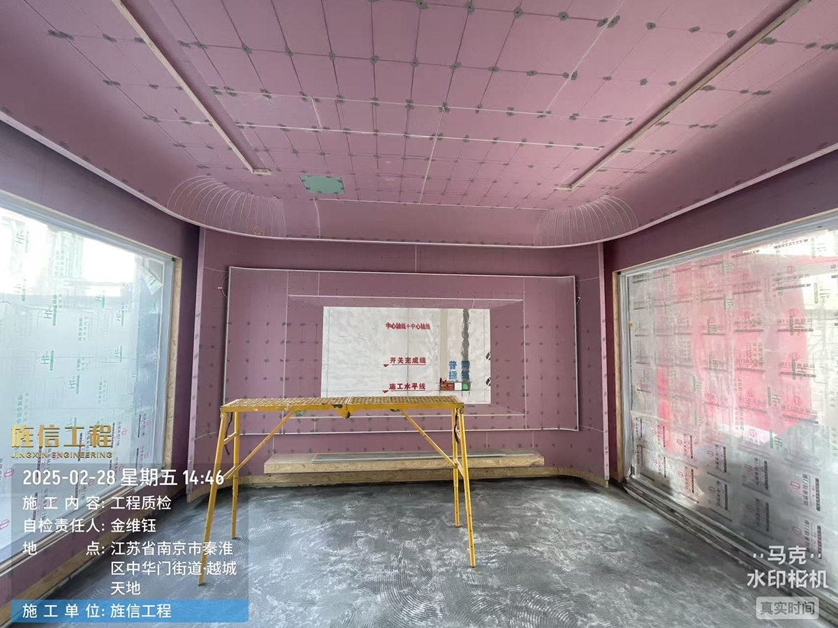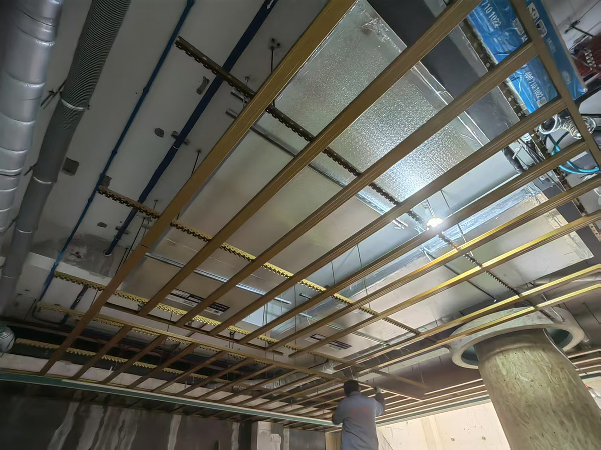 吊顶框架及基层框架,严格按照公司规范施工,吊顶立面龙骨间距60cm,吊顶平面龙骨间距不大于30cm,用铆钉及自攻螺丝固定,局部造型可用欧松板及木制龙骨,需要刷防火涂料,吊顶跨度大于90cm,必须打吊筋加主龙固定。如果室内满吊顶主灯灯位必须加吊筋或木龙骨加固处理。墙面基层框架在需要做基层的墙面放精准十字线,打木塞子固定,不大于40cm间距,基层板调至水平垂直。